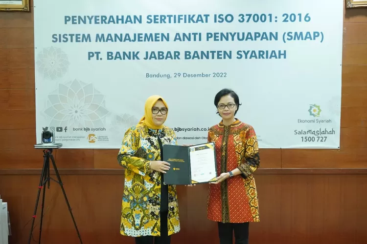 AYOBOGOR.COM - bank bjb syariah menerima Sertifikat ISO 37001 : 2016 Sistem Manajemen Anti Penyuapan (SMAP) di Kantor Pusat bank bjb syariah, Jalan Braga, Kota Bandung, Kamis 29 Desember 2022. Sertifikat tersebut menjadi penanda komitmen perusahaan dalam menjaga tata kelola yang baik.