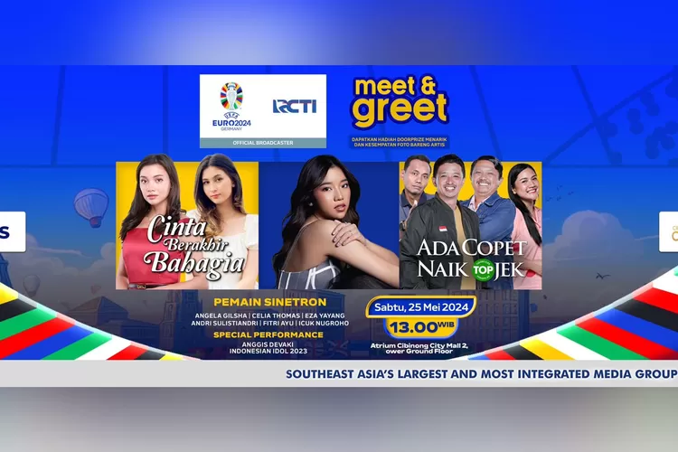 Ikuti keseruan serta kemeriahan Meet & Greet bersama para pemain sinetron 'Cinta Berakhir Bahagia’ dan 'Ada Copet Naik Ojek' hari Sabtu, 25 Mei 2024 pukul 13.00 WIB di Atrium Lantai LG, Cibinong City Mall 2 dan Art Installation Road to EURO 2024 di Lantai GF Cibinong City Mall 1, Jl. Tegar Beriman 1, Cibinong, Kab. Bogor. Untuk warga Cibinong, jangan sampai ketinggalan ya! Acara ini gratis tanpa biaya apapun!